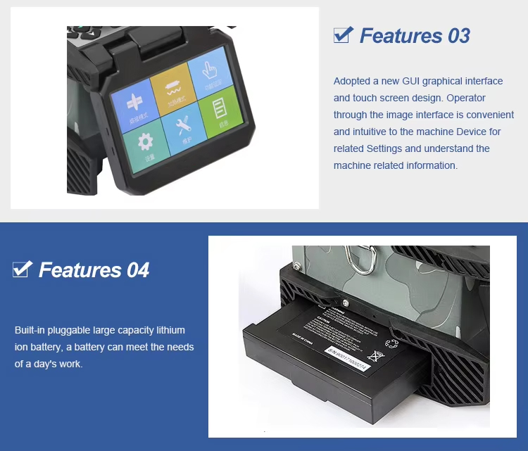 Product Overview 6481 Series Optical Fiber Fusion Splicer is small size optical fiber fusions splicer, mainly used for fusion and protection of common communications fibers. The rich functionality and ultra-low splice loss make the splicer adaptive to fiber splicing in various environments. It is featured with small size, light weight, high reliability, and greater environmental adaptability, dust-resistant, water-resistant and shock-resistant. Multiple fusion modes and heating modes are available to meet diversified customers¡¯ demands. Fiber loading becomes more convenient and accurate thanks to the ceramic V-groove of high precision, which is easy for clean and maintenance. The splicer is capable of dual-directional fusion. The monitor is a touch screen delivers fresh designed graphical interfaces, which are simple for operation. The modular pluggable lithium-ion battery of large-capacity ensures long-time field operations. The auto environment compensation system greatly improves adaptability of the splicer to hostile environments, so that low-loss splice can be remained consistent in various environments. Main Characteristics Small size, light weight 7s fast splicing, 18s highly efficient heating 700/320 times image magnification, 5mm fusing for ultra-short cleave length 300 groups of splice modes, 100 groups of heating modes, 10000 groups of fusion records /64 images storage Ceramic presser foot, ceramic V-groove, all-in-one fixture Dual-directional fusing, auto fusing, intelligent heat shrink USB and SD card interface, auto update of U disk Built-in modular lithium-ion battery, at least 220 counts of splicing and heating cycles GUI (graphical user interface) and touch screen, convenient for operation Dust-resistant, water-resistant, shock-resistant, greater environment adaptability Product Model | 6481A | 6481B | Number of motors | six motors | four motors | Alignment mode | Precision core, cladding, manual | cladding, manual | Applicable optical fibers | Conform to the common optical fibers, skins and jumpers specified in ITU-T G.651-653, G.655 and G.657 | Fiber diameter coating | 80 ~ 150¦Ìm, coating: 0.1 ~ 3mm | Welding loss (typical value) | 0.02dB (SMF); 0.01dB (MMF); 0.04dB (DSF); 0.04 dB (NZDSF) | 0.03dB£¨SMF£©£»0.02dB£¨MMF£©£» 0.05dB£¨DSF£©£»0.05dB£¨NZDSF£© | Welding time (typical value) | 7s (fast mode) | Heating time | less than 15s (40mm, 23¡æ) | Tension test | 1.96 ~ 2.25N | Heat shrink tubing | 60mm, 40mm and a series of heat shrink tubing | Image display | 4.3-inch LCD screen | Weld record | 30000 sets /200 images | 30000 sets | Battery capacity | 11.1V, ¡Ý6400mAh | Battery life | cycle charging times up to 300 ~ 500 times, customers can be replaced | Typical electrode life | 4000 times, which can be replaced by the customer | Construction lighting | Built-in high brightness, wide range of lighting | External power | AC: 100 ~ 240V, 60Hz, 0 ~ 1.5A; DC: 10 to 15V | External | USB/SD (customized) | Dimensions | 120mm (w) ¡Á130mm (H) ¡Á154mm (D) (excluding rubber cushion) | Weight | 1.8kg(without battery), 2.1kg(including battery) | 1.65kg(without battery), 1.95kg(including battery) |