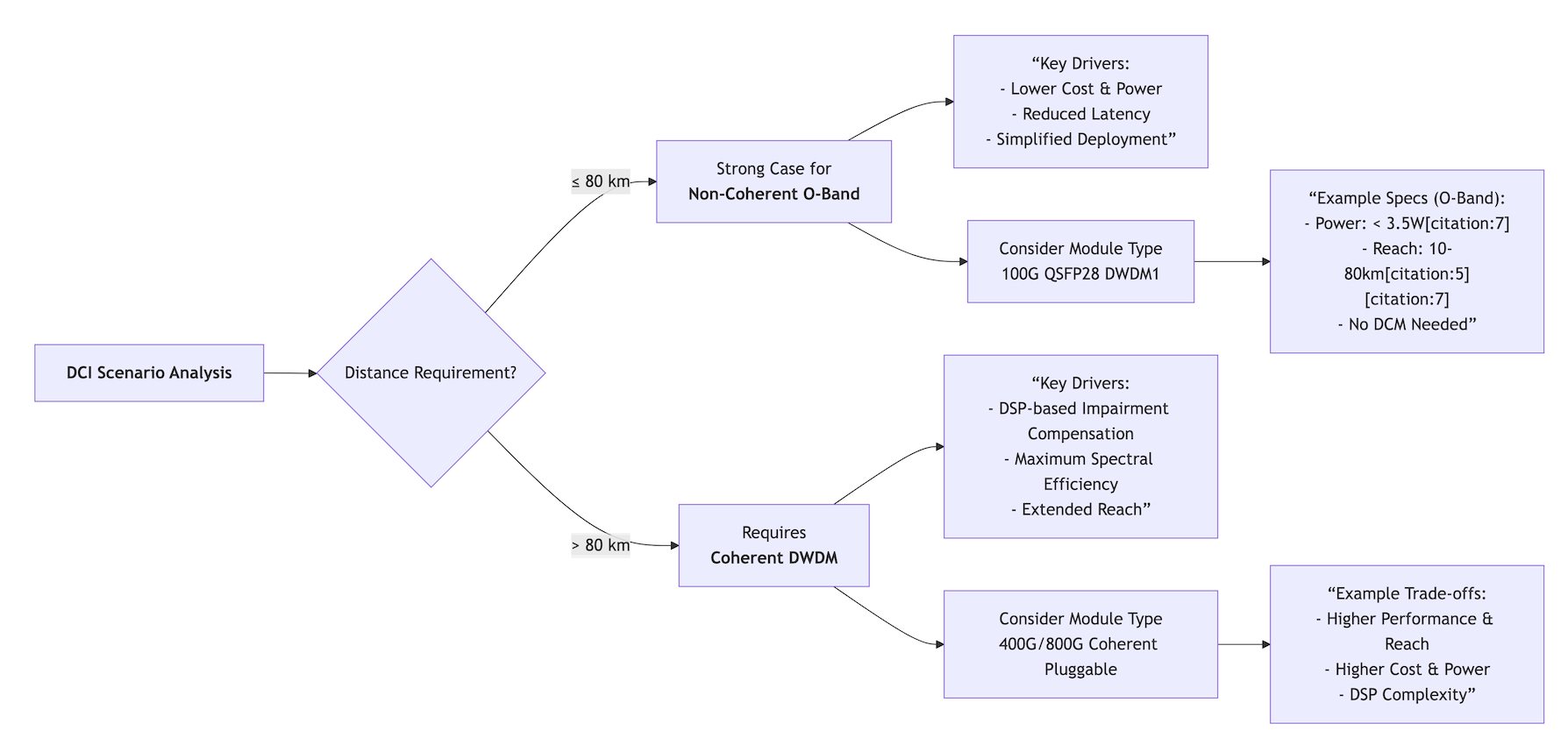 Part 2: A Comparative Analysis for Modern NetworksThe following table summarizes the key distinctions between the two technologies in the context of DCI and metro applications: Recent innovations are expanding the boundaries of both technologies. For coherent systems, the push is toward "coherent lite" architectures that reduce complexity for DCI applications. For non-coherent O-Band, advancements like 100G PAM4 single-wavelength technology are enabling high-density, low-cost solutions for 80km DCI, and research is actively exploring its feasibility for next-generation 1.6 Tbit/s interconnects. Part 3: Strategic Selection Framework for DCI DeploymentsChoosing between coherent and non-coherent O-Band DWDM is not a question of which technology is superior, but which is optimal for a specific application. The decision hinges on three primary factors. 1. Transmission DistanceThis is the most decisive criterion. The diagram below illustrates the typical application "sweet spots" for each technology based on reach: